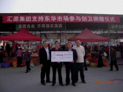 2010年1月31日,市匯源集團為支持位于東華路的東華市場積極參與我市創(chuàng)建全國優(yōu)秀衛(wèi)生城市活動,向東華市場物業(yè)管理處捐款兩萬元。