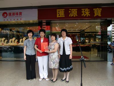 2010年6月1日,河源市匯源珠寶有限公司榮獲廣東省優(yōu)秀愛(ài)心父母(集體)光榮稱號(hào),市婦聯(lián)謝紅英主席在匯源珠寶金行興源店主持頒獎(jiǎng)儀式,市政府葉維園副市長(zhǎng)給匯源珠寶有限公司劉越香總經(jīng)理頒發(fā)了獎(jiǎng)牌、證書。