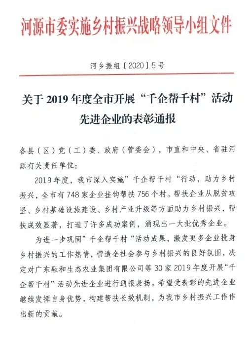 關(guān)于2019年度全市開展“千企幫千村”活動(dòng)先進(jìn)企業(yè)的表彰通報(bào)